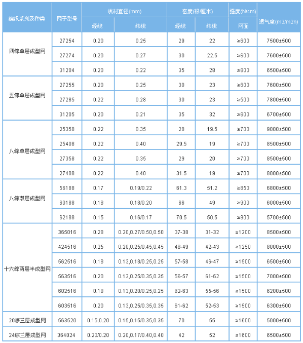 | 十六综两层半成型网 | 二十综三层成型网 |